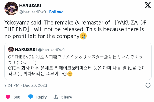 遗憾的是,制作人横山昌义否认了这一可能。他在近期的直播中表示《如龙:终章》的重制/复刻游戏不会为公司带来任何利润。所以不考虑重做。