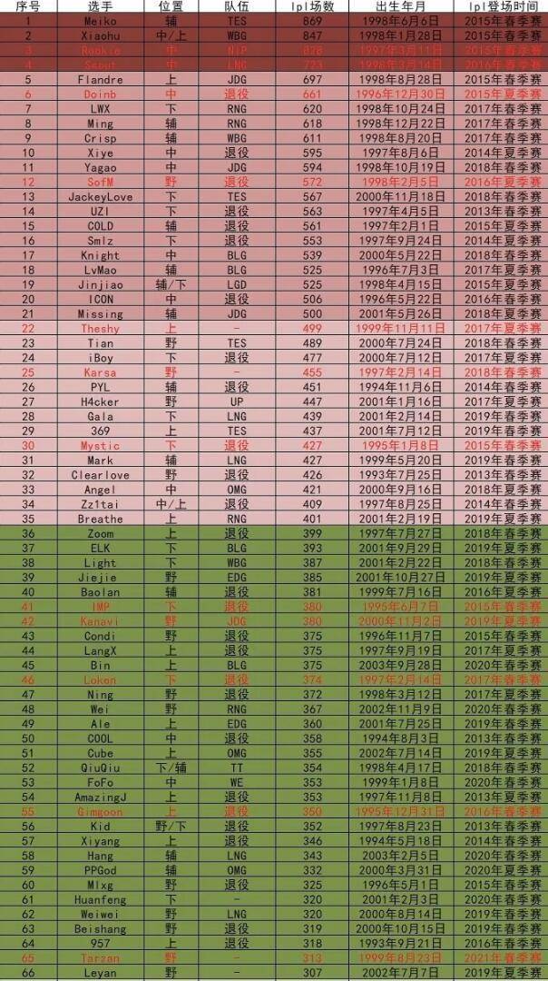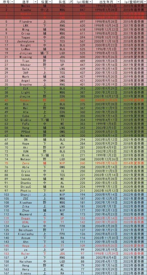 因为他一共在LPL赛区就登场了869次,排名第二的是小虎,在LPL也有847次登场,第三名是rookie,一共是828场,只有这三人是超过800场的,从第四名开始没有超过800场就,第四名是scout,一共是723场。