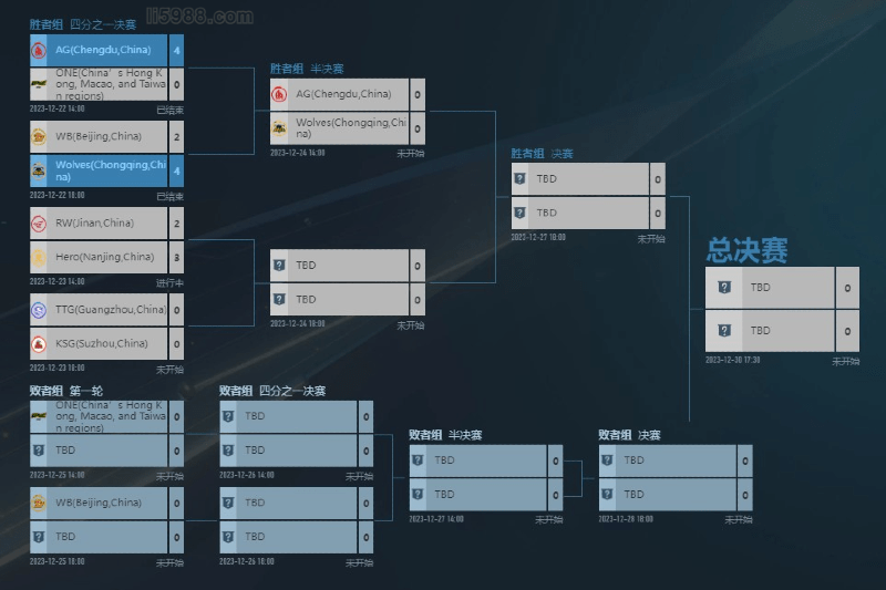 在经过两天的对战后将会决出晋级四强的队伍,目前已经确定晋级四强的队伍分别是成都AG以及重庆狼队,他们将在12月24日14:00进行半决赛,而ONE Team Esports和北京WB将进入败者组于12月25日分别与另外两对进行对决,另外两支晋级四强的队伍会是谁呢?就让我们期待12月23日进行的王者荣耀世冠淘汰赛吧!