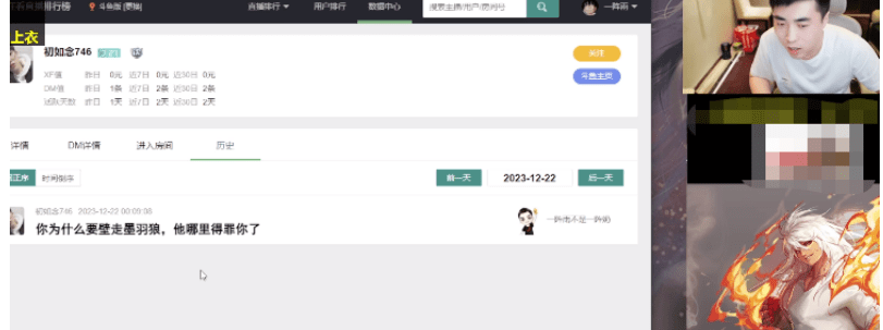 主播一阵雨接着查询该网友的历史弹幕,发现该网友曾经还在直播间吐槽道:你为什么要逼走墨羽狼(也是DNF游戏版块的知名主播),他哪里得罪你了?
