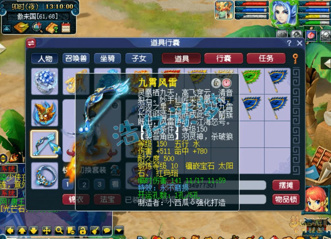 150级永不磨损武器,太阳石和红玛瑙混打了10锻,物理系武器耐久消耗比较快,带一把永不磨损武器还是很有必要的!