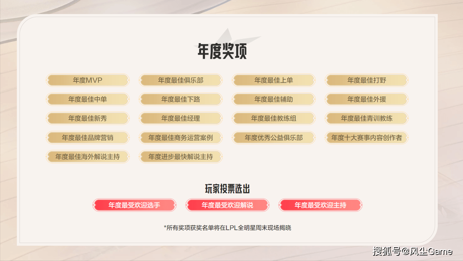 随着S13全球总决赛落幕,一年一度的颁奖典礼也即将到来,在近日,LPL官方已经开启投票通道,所有LOL玩家,都可以票选年度最受欢迎选手、解说、主持,而其他的奖项,会由LPL内部评选,大概率还是各大俱乐部的高层,以及LPL工作人员参与,给出最终答案。