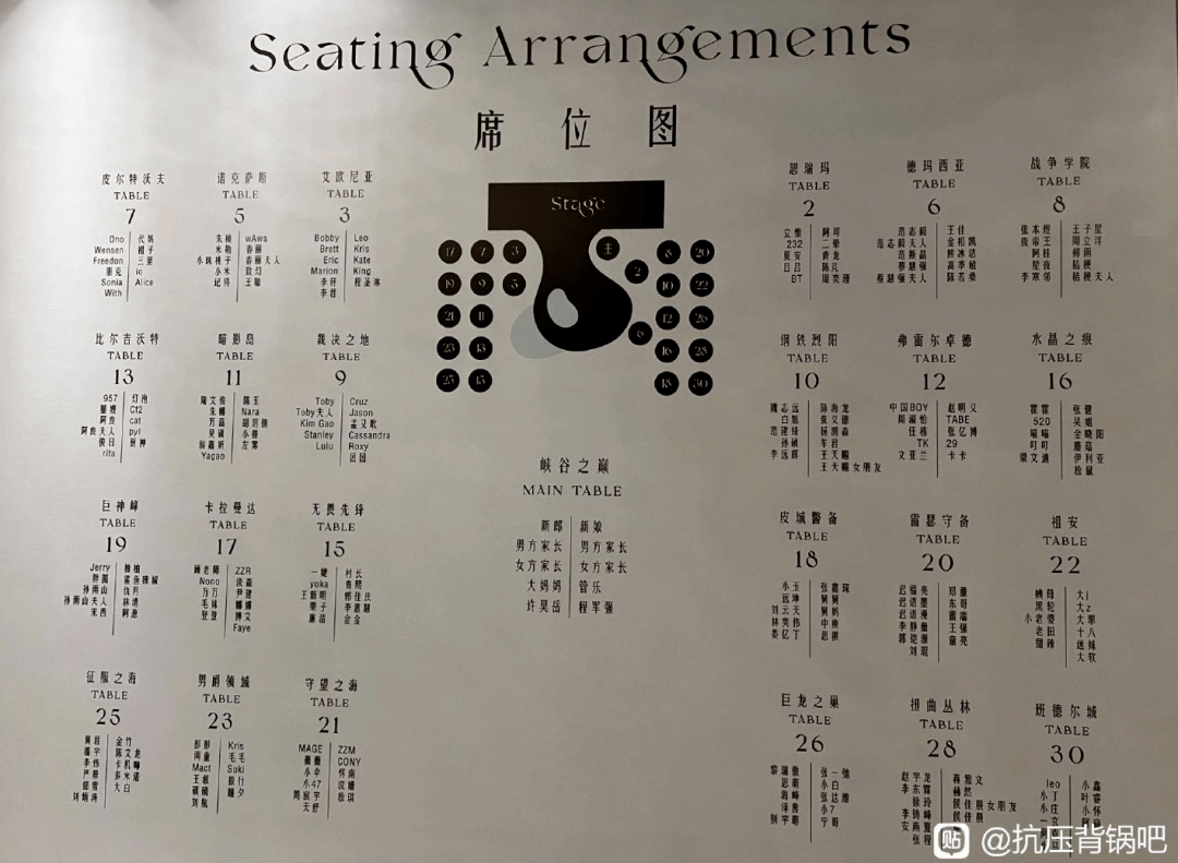 婚礼席位图中每张桌子桌子都是用英雄联盟服务器命名。
