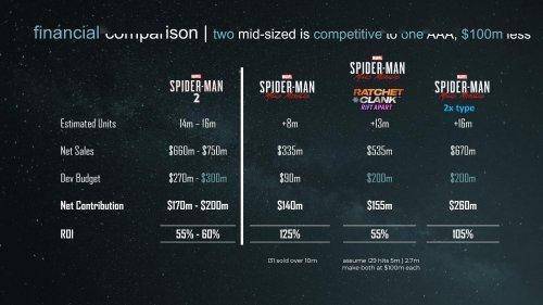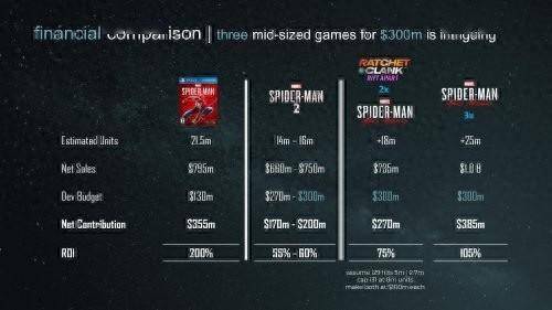 “在十月份时,一位知名内部人士指出,随着制作高预算的AAA游戏变得越来越耗时,工作室越来越倾向于制作规模较小的游戏……PlayStation Studios或许会从失眠组的《蜘蛛侠:迈尔斯莫拉雷斯》中汲取经验。一份泄露的PPT显示了像《迈尔斯莫拉雷斯》这样的较小型游戏的财务回报状况,该游戏也带来了商业上的成功。”