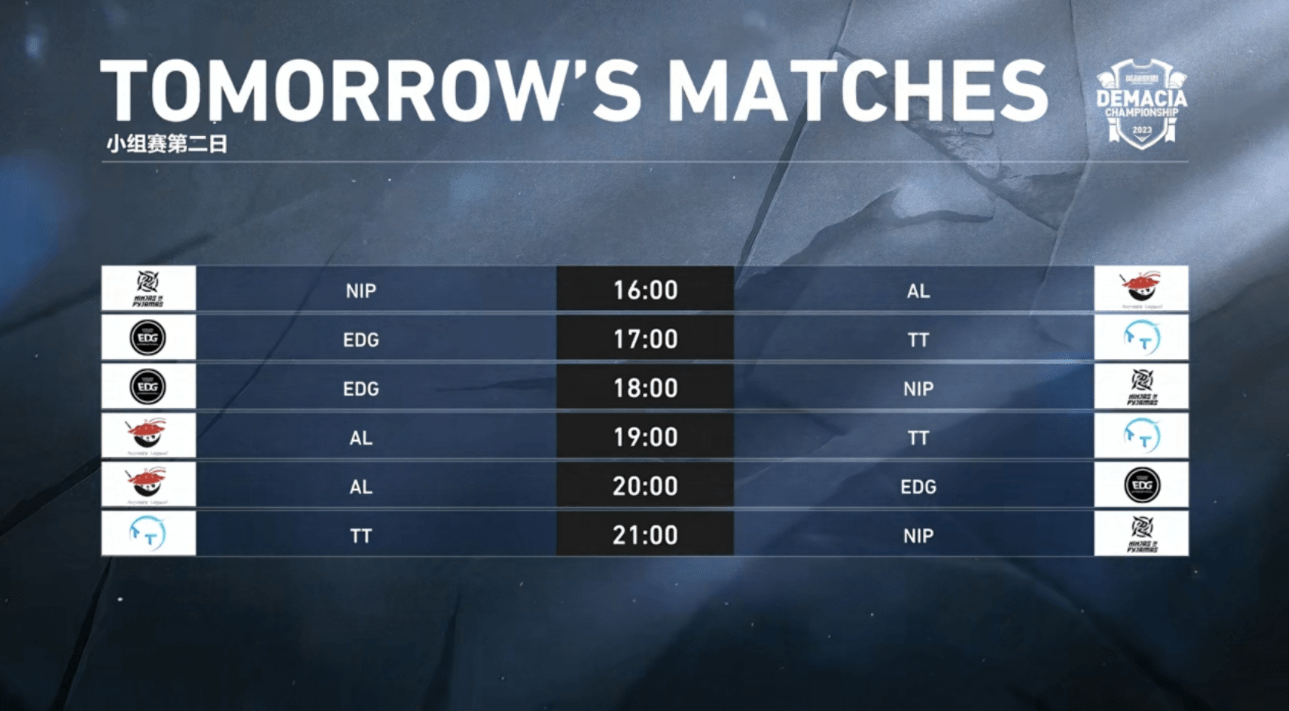 明天的德玛西亚杯比赛将是A组的四支队伍NIP、EDG、AL、TT。这四支队伍将争夺一个八强名额。