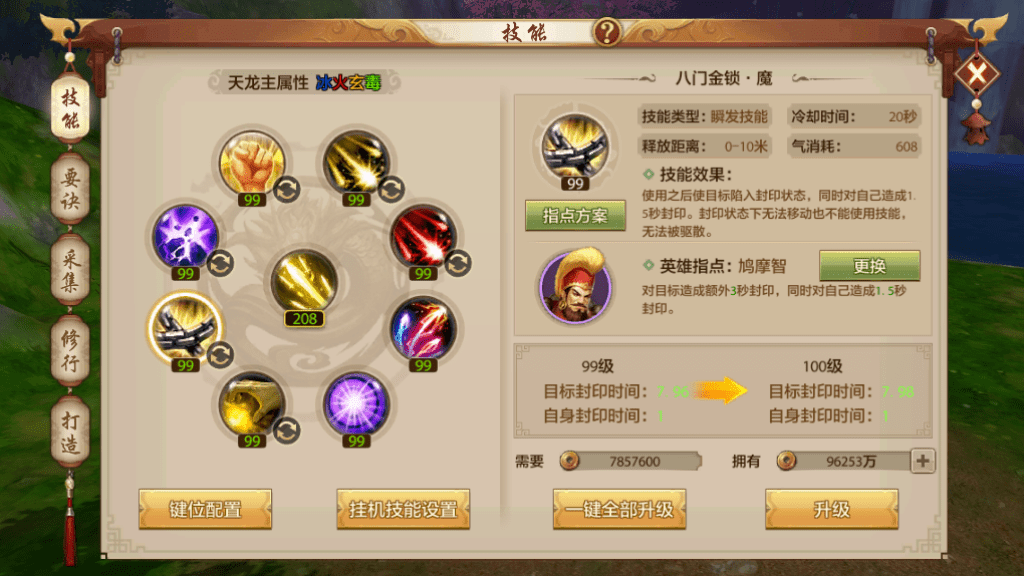 在单挑模式中,八门金锁·魔(鸠摩智指点)也是为天龙创造输出空间的一大利器,能对目标额外造成3秒封印,但同时也会对自己造成1.5秒的封印,可谓是杀敌一千自损八百。