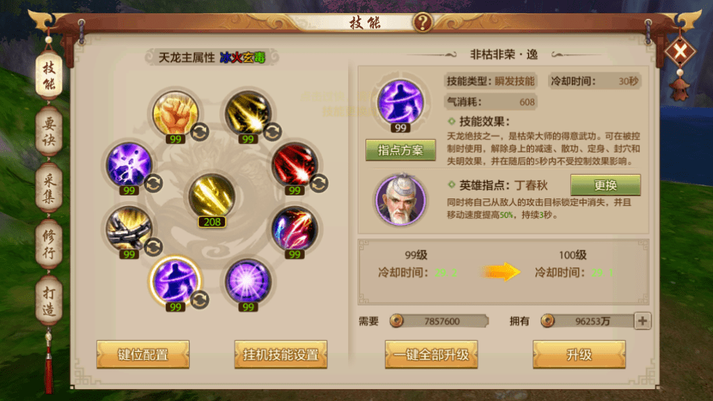 这一技能的出现让天龙重新回到了大众的视野里,可在被控制使用,能解除身上的减速、散功、定身、封穴和失明效果,并在随后5s内不受控制效果影响。丁春秋指点可以使移动速度提高50%,更能让天龙可以将自己从敌人的目标锁定中消失,有了近似隐身的强大保命能力!