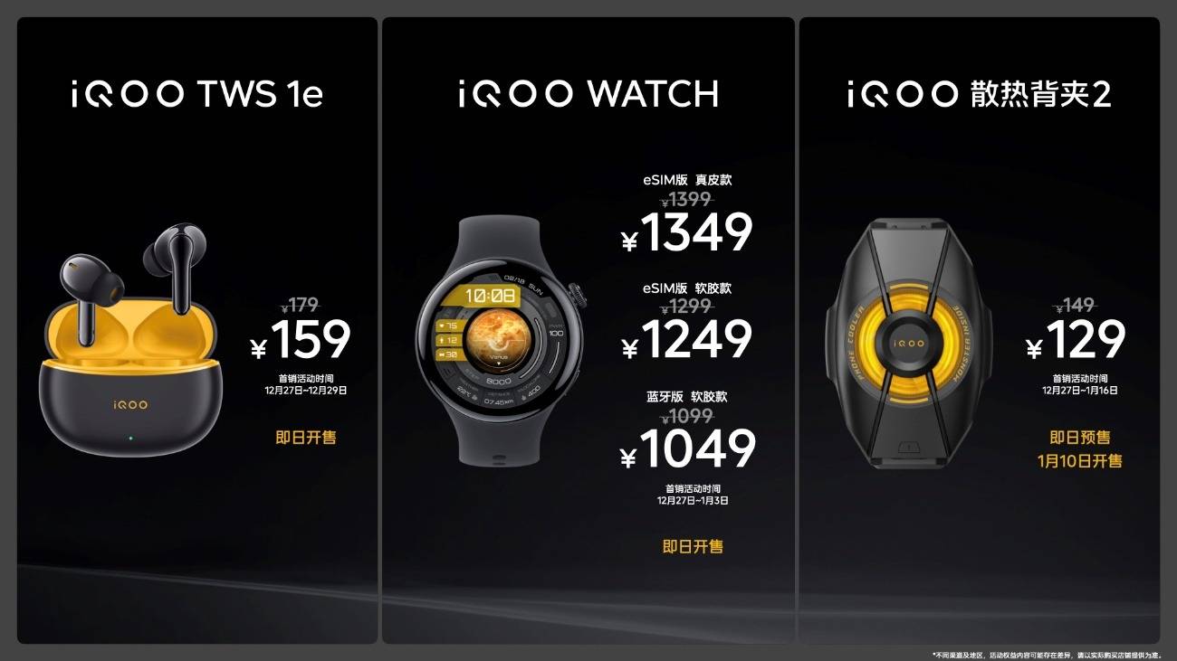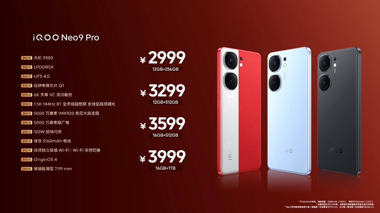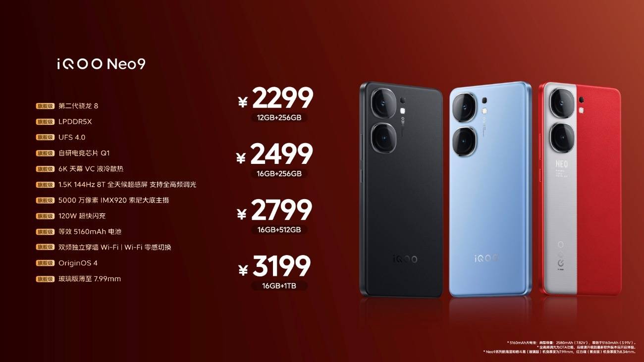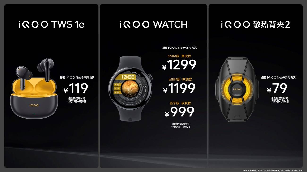 iQOO Neo9系列共有红白魂、航海蓝、格斗黑三种配色,iQOO Neo9售价2299元起,iQOO Neo9 Pro售价2999元起。2023年12月27日至2023年12月30日期间,线上渠道购买iQOO Neo9系列将获赠iQOO影音耳机,并可享受至高24期免息购机。首销活动期间,iQOO WATCH、iQOO TWS 1e、iQOO 散热背夹 2促销优惠价分别为1049元起、159元、129元,搭配Neo9系列手机购买,也可享受组合购权益。