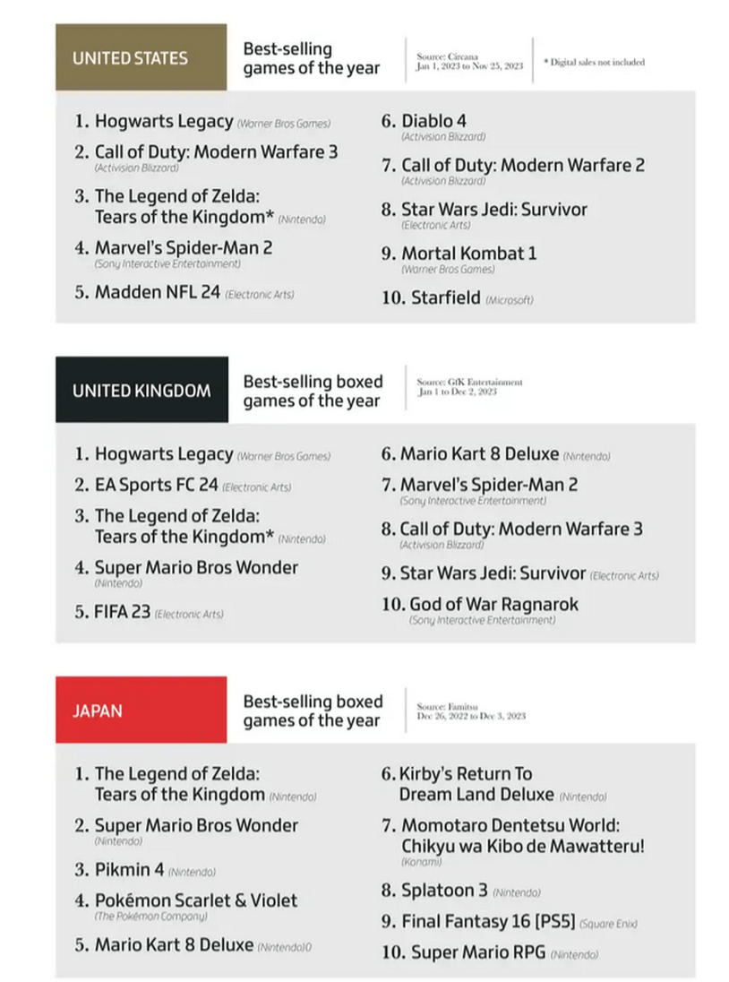 7.【英国市场销量排名TOP3】:霍格沃茨之遗、FC 24、王国之泪(不含数字版)