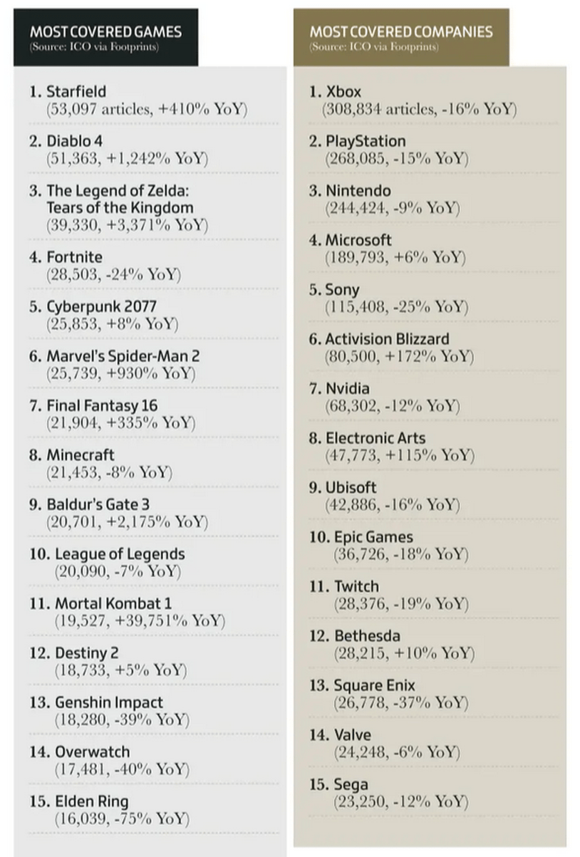 【2023年《星空》讨论度与曝光量最高】外媒Gamesindustry发布了2023游戏行业相关数据排名,包含了2023年游戏讨论度排名、抖音(海外)游戏热度排名、各国地区游戏销量排名等各大榜单。(其数据来源于footprints、Newzoo、Sensor Tower等权威数据机构)。以下是部分排名的TOP3: