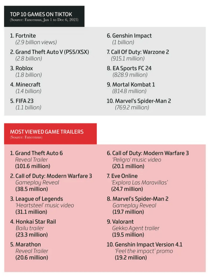 2.【观看最多的游戏预告片TOP3】:GTA6、现代战争3、LOL;