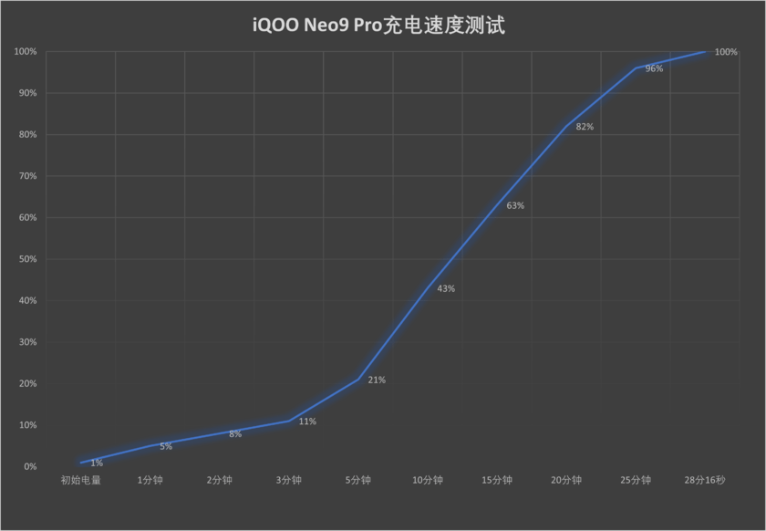 iQOO Neo9 Pro作为一款性能旗舰,配备了等效5160mAh超大电池,配合120W有线超级闪充和超强的散热系统,在充电时保证更高的散热效率,以更高的充电功率持续向电池输入能量。经过我们的实测,从1%开始充电,前5分钟充电至21%,15分钟充电至63%,28分16秒即可充满。超快的充电速度,配合超5000mAh的大容量电池,基本不会出现电量焦虑的问题。