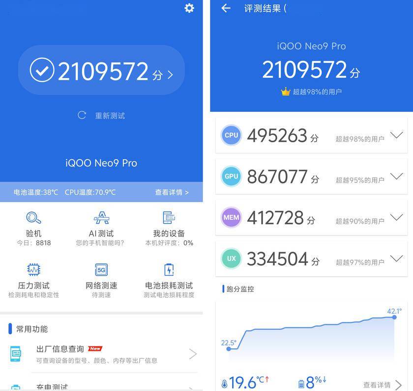 我们先使用了安兔兔V10版本对iQOO Neo9 Pro进行了理论性能测试,在室温22度的环境下,这款手机跑出了2109572分的总成绩,综合成绩相比前代搭载天玑9200+的iQOO Neo8 Pro提升了将近32%。显然,天玑9300的全大核架构对性能的提升是显而易见的。但值得注意的是,iQOO Neo9 Pro在测试过程中的温度变化也相当明显,短时间内温度升高了19.6℃,这突显了该手机在散热方面所面临的挑战。