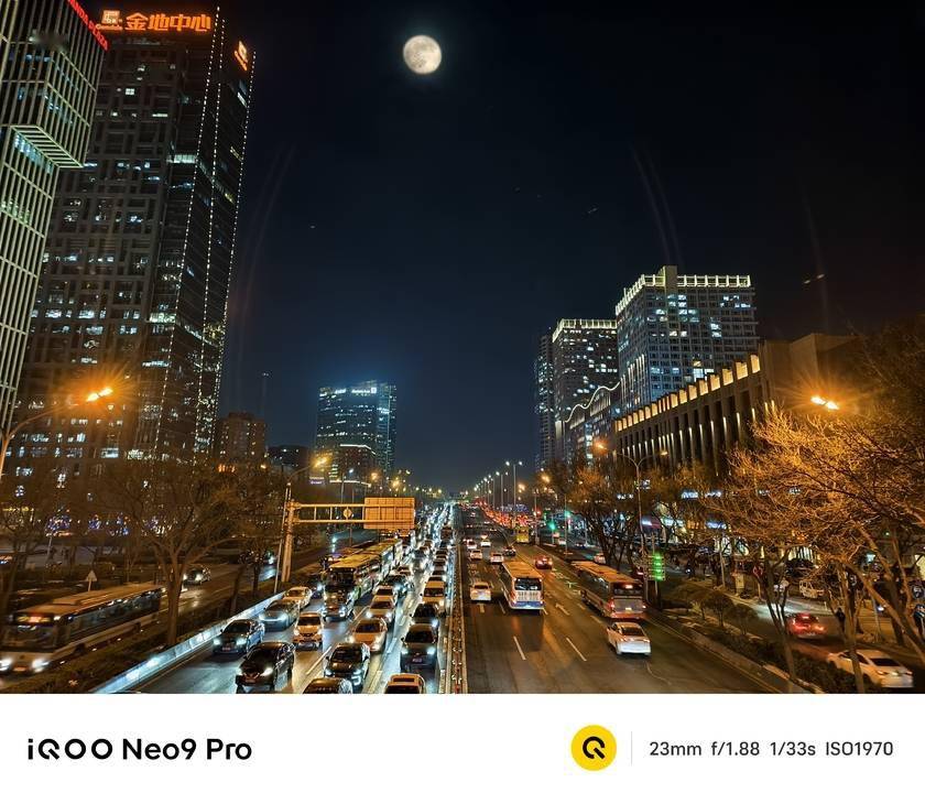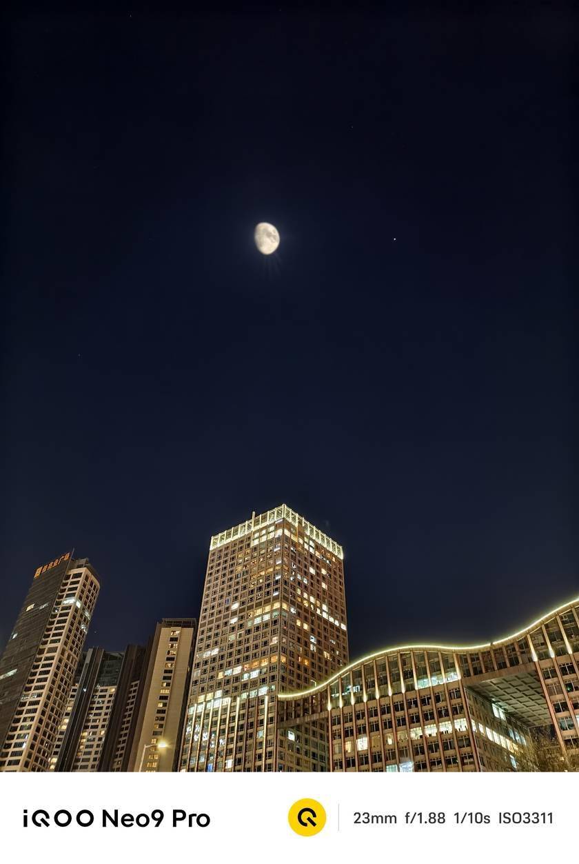 iQOO Neo9 Pro还为广大消费者带来了全新的“地景月亮”功能。该功能能够进行双重曝光,融合地面上的景物和天空之中的月亮。从下方样张可以看出,手机能够准确还原出建筑物外墙灯光的真实色彩,没有出现明显的色彩偏移。样张呈现出通透、干净的特点,画面中没有明显的鬼影现象。然而,月亮的呈现显得过于“艺术化”,算法介入的痕迹较为明显,希望后续能通过OTA优化一些算法,让“地景月亮”功能更加可用。