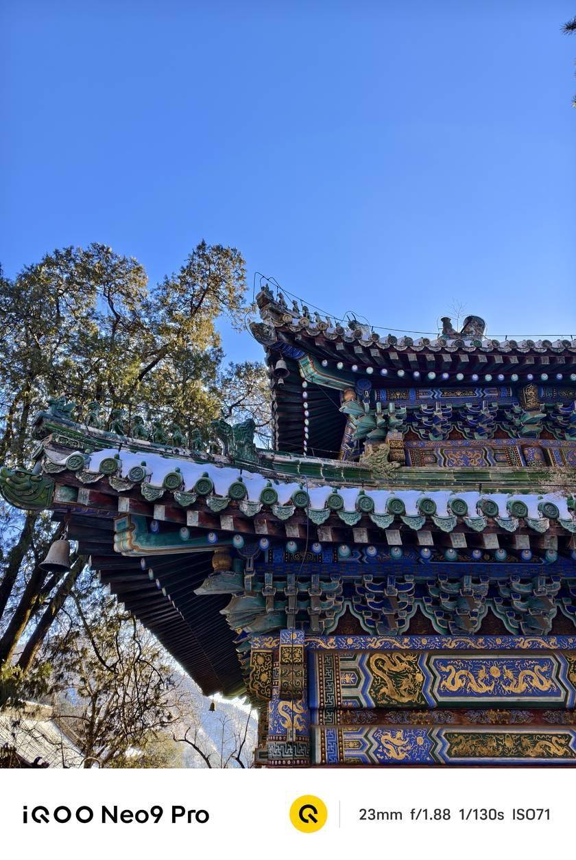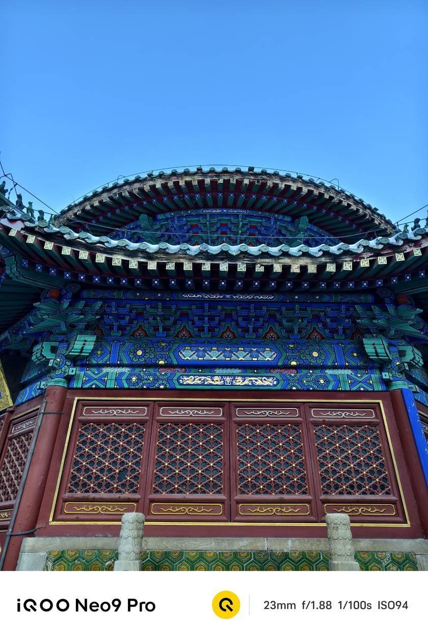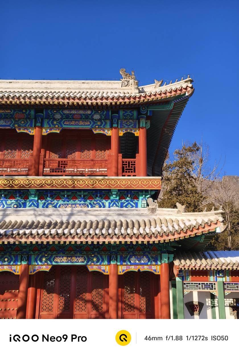 在白天光线充足的环境下,iQOO Neo9 Pro主摄所拍出的样张,画面整体干净通透,色彩还原较为艳丽,饱和度偏高,并且在拍摄颜色绚丽的古建和植物等,都会比现实中的颜色更鲜艳,看上去让人赏心悦目。当然,如果你不喜欢鲜明色彩风格,这款手机也提供有质感、自然色彩,将色系的选择交给用户,方便用户根据拍摄场景去选择不同的色彩,更好地展现出自己的创作风格;iQOO Neo9 Pro的2X焦段是通过主摄镜头的电子变焦实现的。得益于这枚5000万像素的大底CMOS,尽管经过了裁切,但画面的清晰度也经得起仔细推敲,并且画面宽容度也有不错的表现,样张整体观感十分优秀。