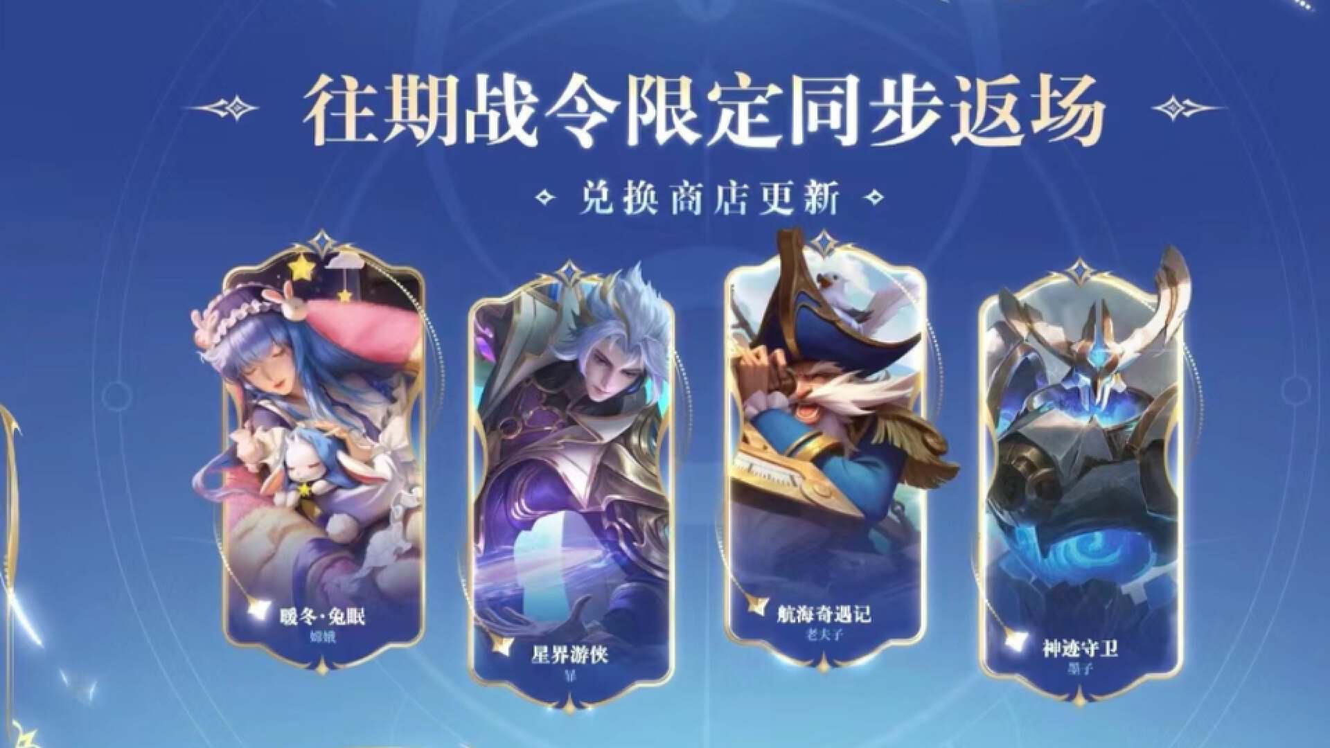 然后在新赛季战令皮肤的返场规则也迎来了一些改动,在新一期战令开启的同时,往期战令皮肤就会迎来返场,获取方式依旧是用战令币兑换宝箱,开启宝箱获得战令皮肤。新赛季返场的战令皮肤分别属于暃、嫦娥、老夫子墨子这些英雄。