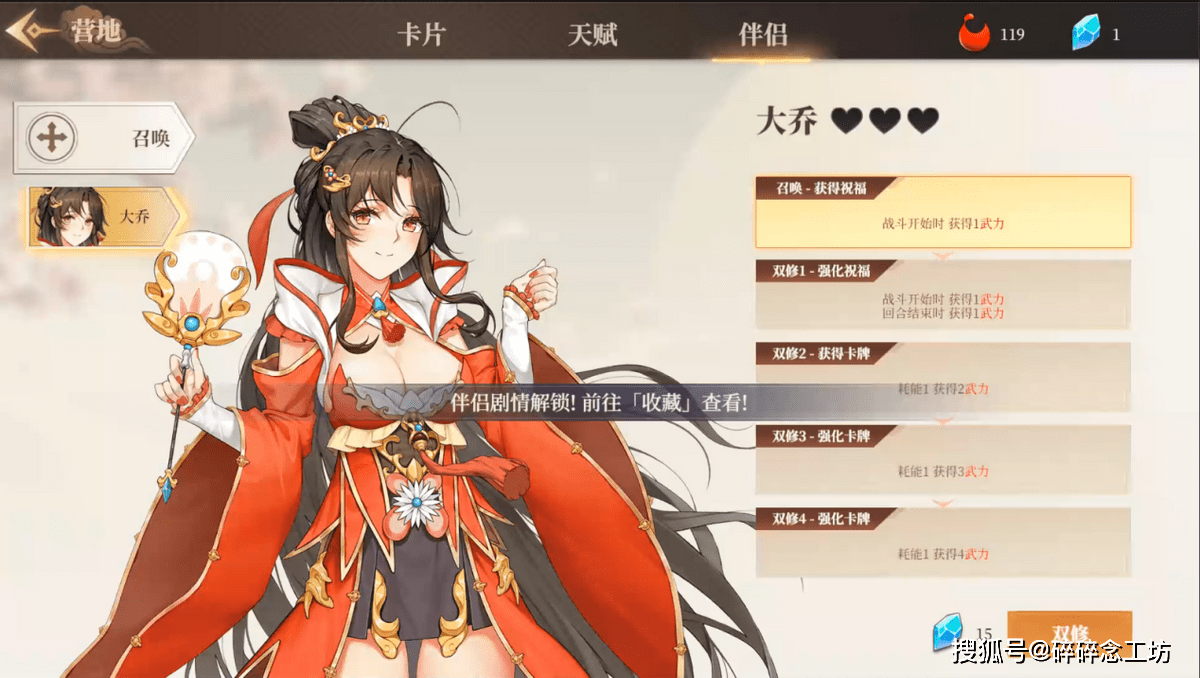 伴侣的作用是给曹操提供各种BUFF效果,其中包括增加血滴和水晶收入的能力。每局战斗中可以同时配备多位伴侣,如果玩家能够及早抽到功能合适的美女,在重点培养其效果的基础上再合理搭配卡组,战斗力必然倍增——比如貂蝉初始技能是给敌人施加乏力效果,在升级之后又能进一步削弱对手武力,加上适当时机使用防御卡牌,一般敌人就无法给你造成什么大的威胁。