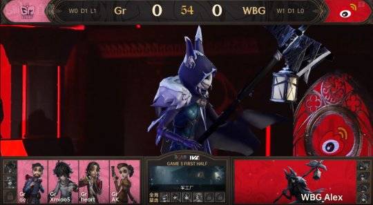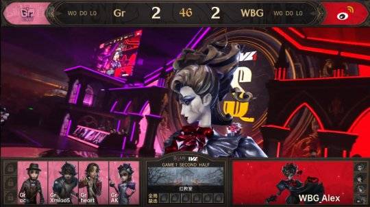 Gr的求生者选择了祭司、飞行家、前锋、杂技演员(BAN歌剧演员、蜘蛛、蜡像师);WBG的监管者Alex选择了红蝶。(BAN先知、拉拉队员、古董商、律师)