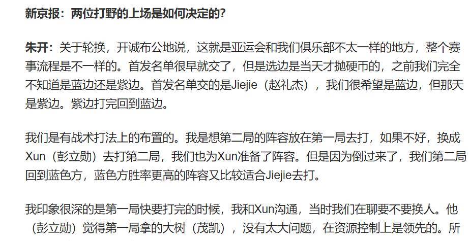 首先是朱开将亚运会的失利归咎于中途的换人,原话是这样的:5月份第一次选完人后,我自己觉得面对国外队胜率是五五开的,我们是有得打的,但是在换完人后,我自己觉得我们是略处下风的。不是游戏上的差距,而是队内氛围,以及短时间的磨合让我很担心,从原本五五开的局面变成了需要去拼一拼才能和对手竞争,我们之前的部署都被打乱了。
