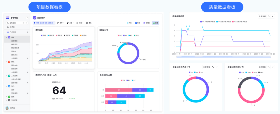 在计划管理层面,飞书项目中的里程碑字段详情页可以明确里程碑信息,避免目标在组织内反复宣贯。需求实时统计反馈能帮助团队更好需求定容,聚焦高优内容。变更管理插件对变更进行监控则让变更具合理性。计划始终统一、清晰,减少了不确定性。