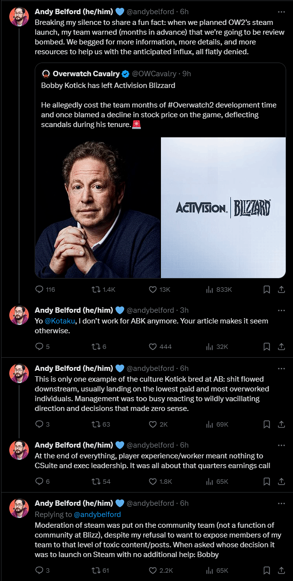 他首先转发了一则推文,该推文内容如下:“鲍比·科蒂克耗费了《守望先锋2》团队几个月的开发时间,并曾将股价下跌归咎于游戏,以转移自己任职期间的丑闻。”
