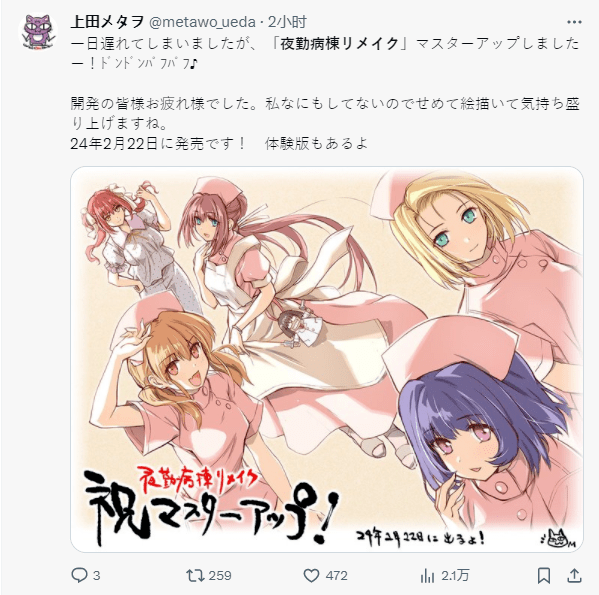 《夜勤病栋REMAKE》发行商为新成立的FG Remake同时也是该品牌的第一款作品,原画由上田メタヲ担当。这款游戏最初诞生于1999年,当时的开发商Mink曾于2018年倒闭。