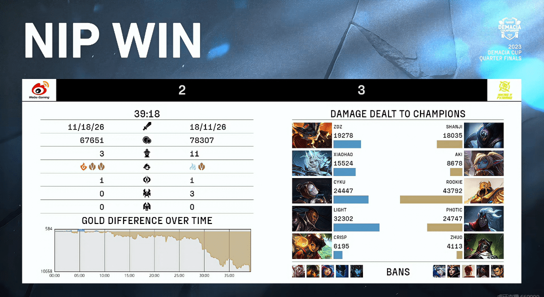 NIP击败WBG成功晋级到了四强,他们的下一个对手是RNG和BLG的胜者。