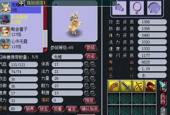 然后说一下宝宝的要求。全力攻宠的伤害达到1900,速度240左右就够用了。因为大鬼速度在240左右,考虑到坐骑饰品还可以提速,基本很少乱敏。自己练的话,建议选择龙鲤,4-5技能即可,自己拍夜战,不掉高连龙游就可以带个高驱套子自己用。再者是变异芙蓉,4技能蓝书带高连套。或者更贵一点,变异鬼将,技能同上。如果是买号带的全力攻宠,有什么用什么,属性达标即可。