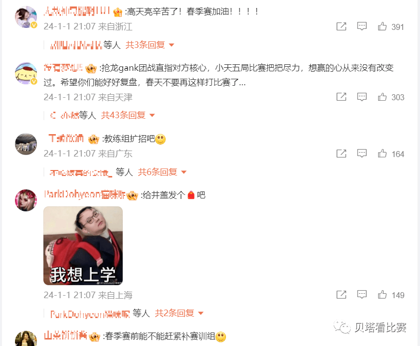 比赛结束后,TES官博下方的评论如下,大部分粉丝都在心疼tian,直言他辛苦了,这五场比赛真的都尽力了,打出了该有的作用,希望春季赛可以继续加油!也有粉丝责怪教练组,直言教练井盖的BP有问题,希望TES的管理层在这次德杯失利后,赶紧扩招教练组。