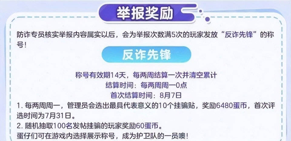 在防诈技术和系统升级等方面,《蛋仔派对》还上线了“诈骗-诈骗阻断-诈骗举报”等三大核心反诈产品功能,进一步筑牢了反诈防线。该功能能够在游戏里24小时不间断地识别、切断、核实以及封禁疑似诈骗的不法行为,一旦玩家在与陌生玩家聊天的时候触犯了相应的敏感词,就会有防诈提醒弹出来防止玩家被骗。另外,玩家如果在游戏中发现了疑似诈骗行为,可以直接在“举报欺诈入口”进行举报,举报成功后还会有奖励。