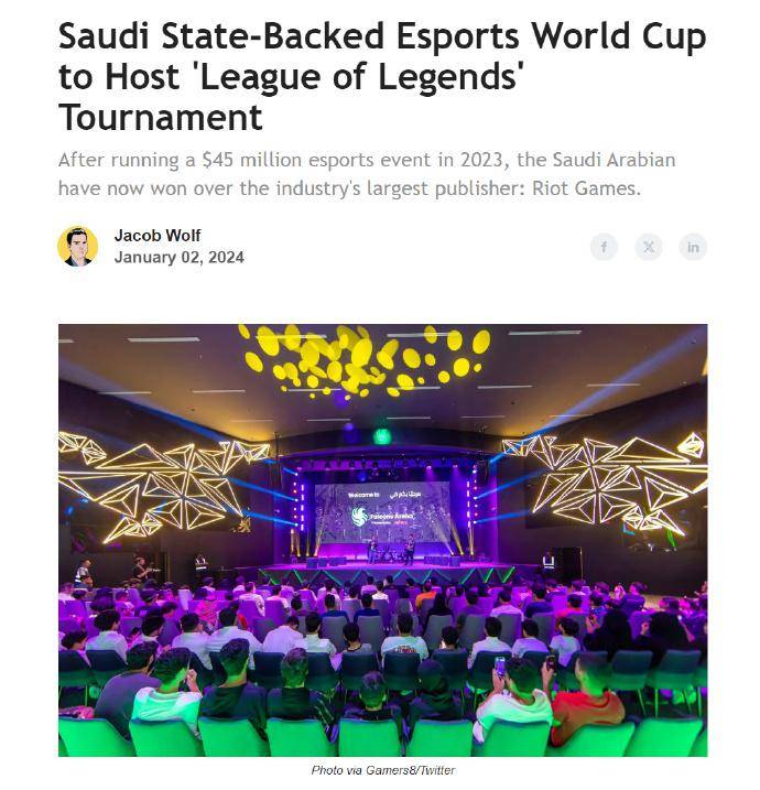 根据知名电竞记者Jacob Wolf在1月3日的最新报道,他获得了一份拳头游戏在新年假期中发送的内部邮件信息。根据该邮件显示,由沙特阿拉伯政府支持的电竞世界杯赛事,将于2024年7月拉开帷幕,这个赛事包括英雄联盟项目。