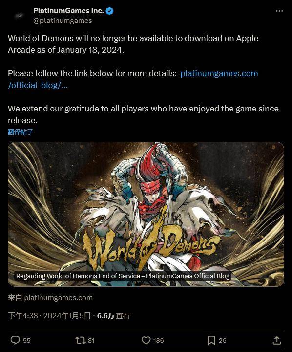 白金工作室日前宣布,其苹果订阅服务 Apple Arcade 独占手游《百鬼魔道》即将于 2024 年 1 月 18 日终止服务并不再提供下载。