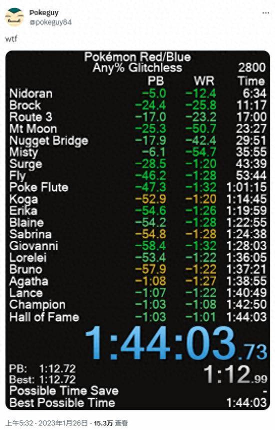 在2023年,著名的速通玩家Pokeguy以1小时44分钟03秒的时间创下了《宝可梦 红》 ‘Any% Glitchless’ 类别的世界纪录,人们认为没有人可能超越他。