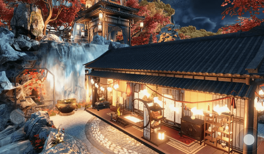 看到画面正中间的环廊设计了吗?我都不敢想走在这里我会有多开朗!在往上一看,依山而建的楼宇灯火通明,尽显大户人家风范!火红的树叶与金黄的树叶交相辉映,其间还有潺潺流水和壮观的瀑布,真的做到了自然景观与建筑的和谐统一!如果你真的有设计天赋,那么逆水寒手游会是你大展身手的舞台!