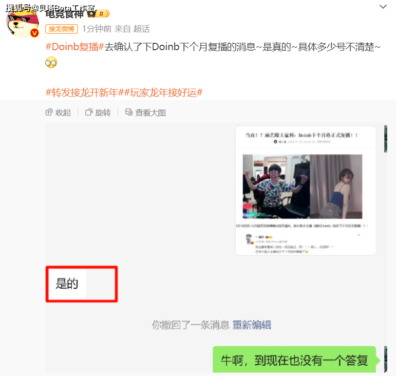 斗鱼大主播指的就是doinb,而除了涵艺之外,另一位微博大V也更新爆料,表示自己在看到涵艺爆料后,去询问了知道内幕的相关人员的,得到的答复是doinb确实将在下个月复播。