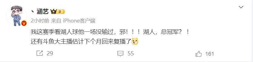 涵艺爆料的原文如下,他先是发文讲了一下NBA的一切比赛情况,然后突然话锋一转,爆料:斗鱼大主播估计下个月要回来复播了!