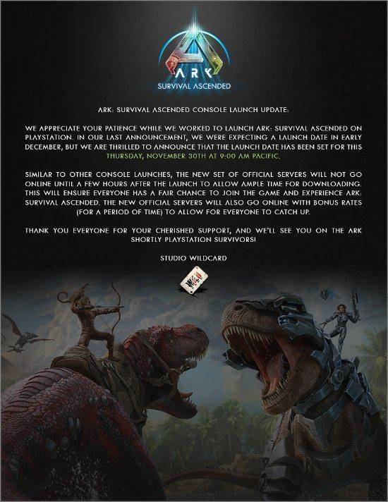 《方舟:生存飞升》官方此前曾发布声明称,本作的PS5版本将延期至12月发售。不过今日官方突然宣布,PS5版《方舟:生存飞升》将于11月30日,也就是明天正式推出。