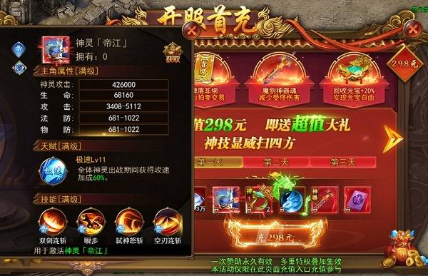 如果你想一步到位,一开始就体验到攻速增加到60%的话,开服赞助是有不错的选择,充值298即送超值大礼,除了满级攻速加到60%以外,还有各种神技,神装等,最主要的还在于三天都有超值礼包赠送,技能书,神器,钻石,好不划算。