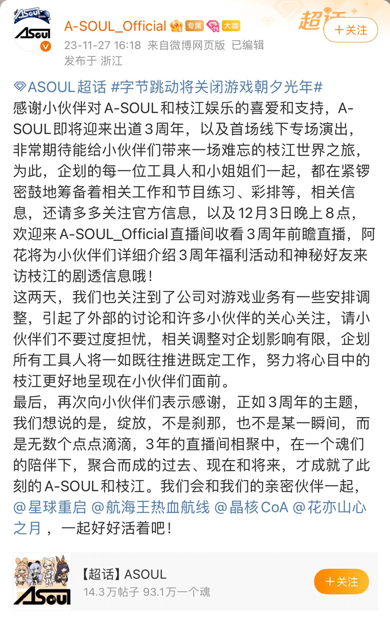 而关于最近字节跳动游戏业务波动可能对A-SOUL运营带来的潜在影响,官方也发微博表示“相关调整对企划影响有限,小伙伴们不要过度担忧”,为广大粉丝吃下一颗定心丸,众多粉丝也在评论区为A-SOUL团队加油打气