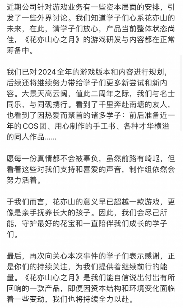 此外,《花亦山心之月》《航海王热血航线》也先后发布公告,辟谣项目组解散嫌疑。《花亦山心之月》团队表示,产品当前整体状态尚佳,《花亦山心之月》的游戏研发与内容都在正常筹备中。即便因资本结构和环境变化面临一些变动,但也将持续全力以赴。