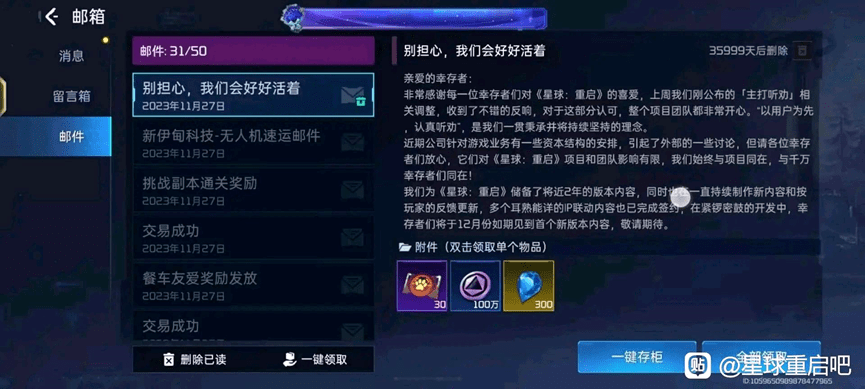 图:《星球:重启》给全体玩家发送标题为“别担心,我们会好好活着”的邮件
