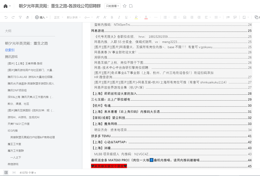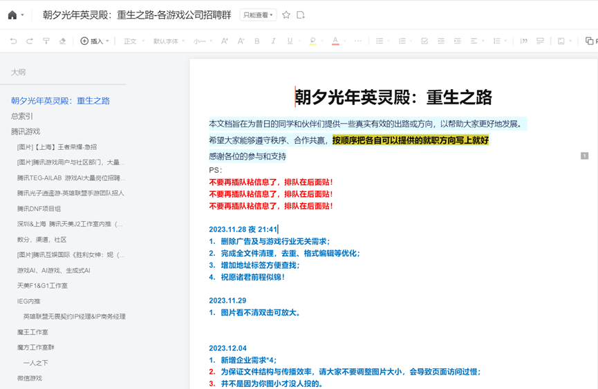 此外,专门面向朝夕光年“毕业”员工的招聘文档——“朝夕光年英灵殿:重生之路”也上线了,目前已经写到了174页,汇集了各大游戏公司的招聘信息,成了朝夕光年的“英灵殿”。