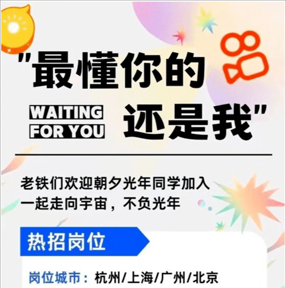 相比于只有腾讯天美与FunPlus的HR前往现场抢人,更多公司HR选择在网上加入“抢人”大战。比如字节跳动的老对手,另一家短视频巨头快手发出招聘公告并写道:最懂你的还是我,欢迎朝夕光年同学加入,一起走向宇宙,不负光年。