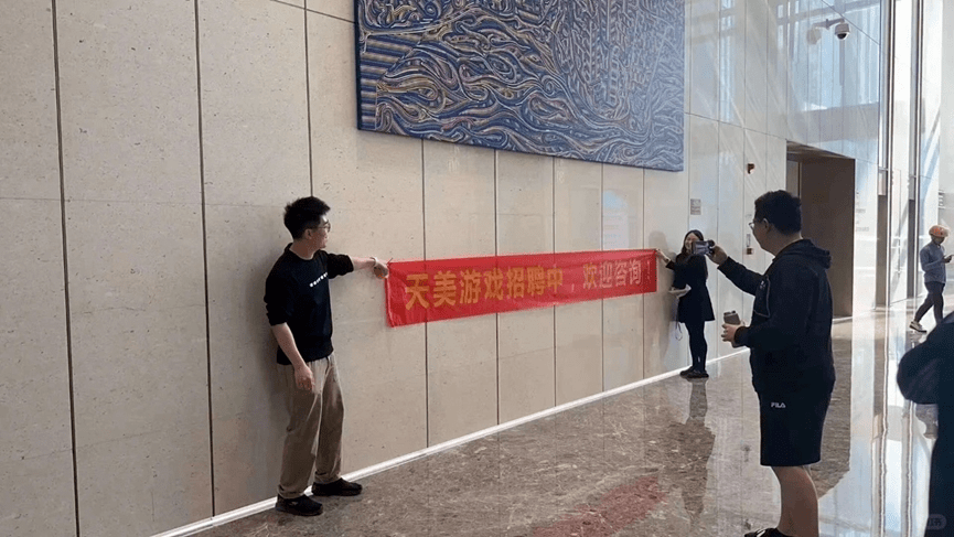 图:腾讯天美HR在朝夕光年的办公楼下拉出了一条横幅,上面写着“天美游戏招聘中,欢迎咨询!”