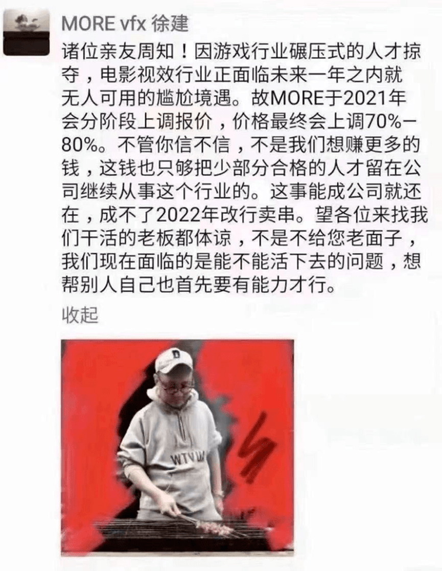 图:视效制作公司MORE VFX创始人徐建发布朋友圈,吐槽游戏行业正在进行“碾压式的人才掠夺”, 为了留住员工,准备把报价上调70%~80%