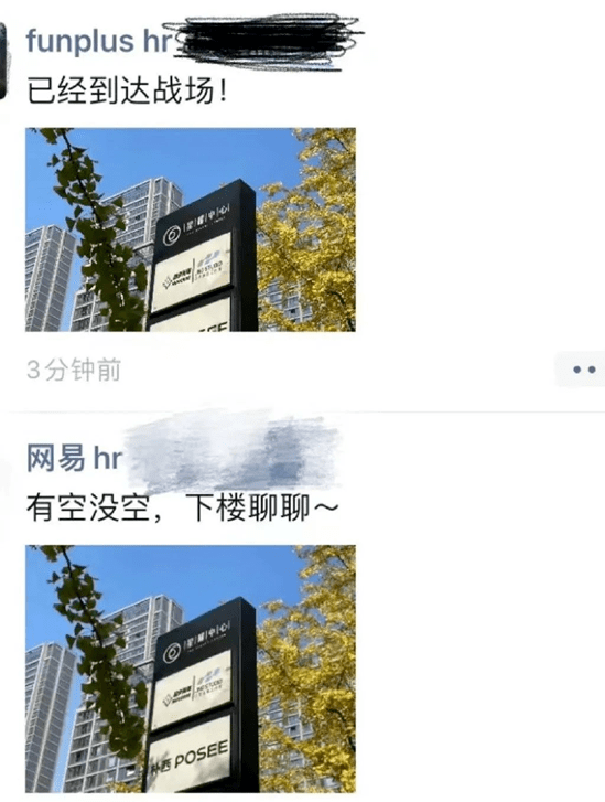 另有一张截图显示,FunPlus(趣加)HR与网易HR均在朋友圈发布了朝夕光年的办公楼同一张照片,只是FunPlus HR配的文字是“已到达战场!”而网易HR配的文字则是“有空没空,下楼聊聊~”。