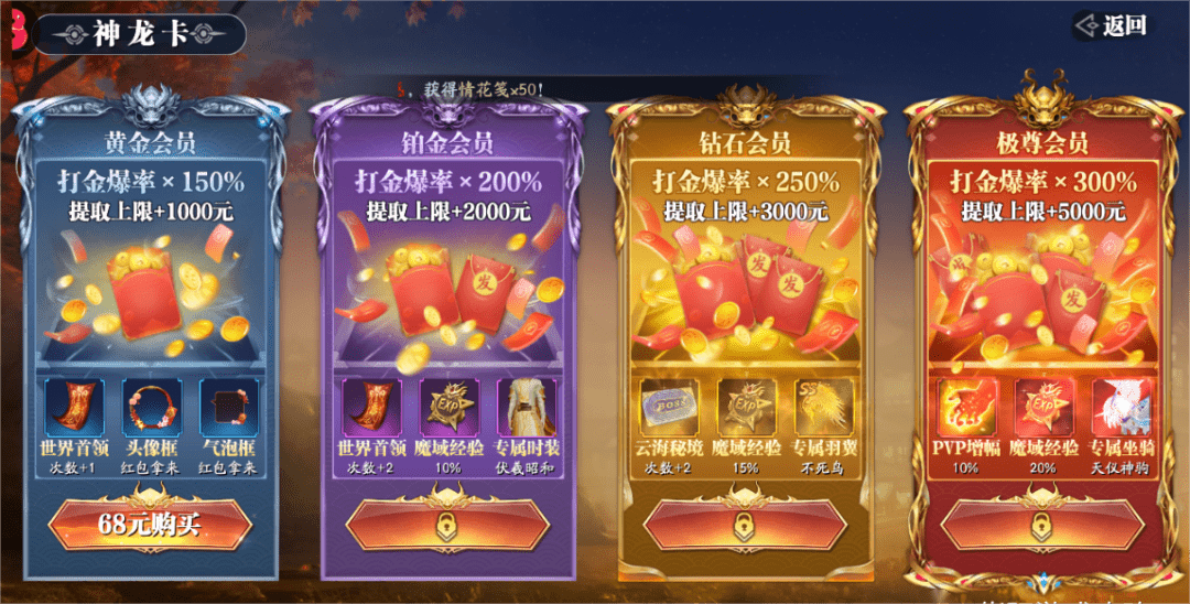 价值:直升98+神技30+四张神龙卡黄金68 铂金128 钻石328 极尊648(共计1300元因为五折福利只需要650元开通三大件)