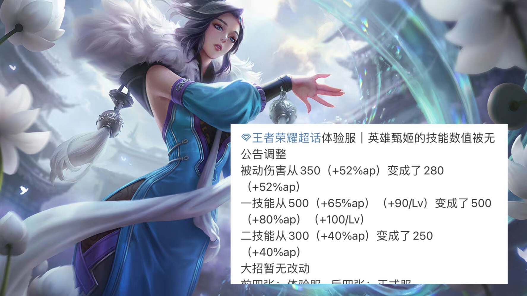作为老牌法师,甄姬算是比较惨的一位了,因为一般来说老牌英雄都是加强,只有她是削弱。不过目前这个设定也只是在体验服,具体调整还需要看正式服的最终品质。