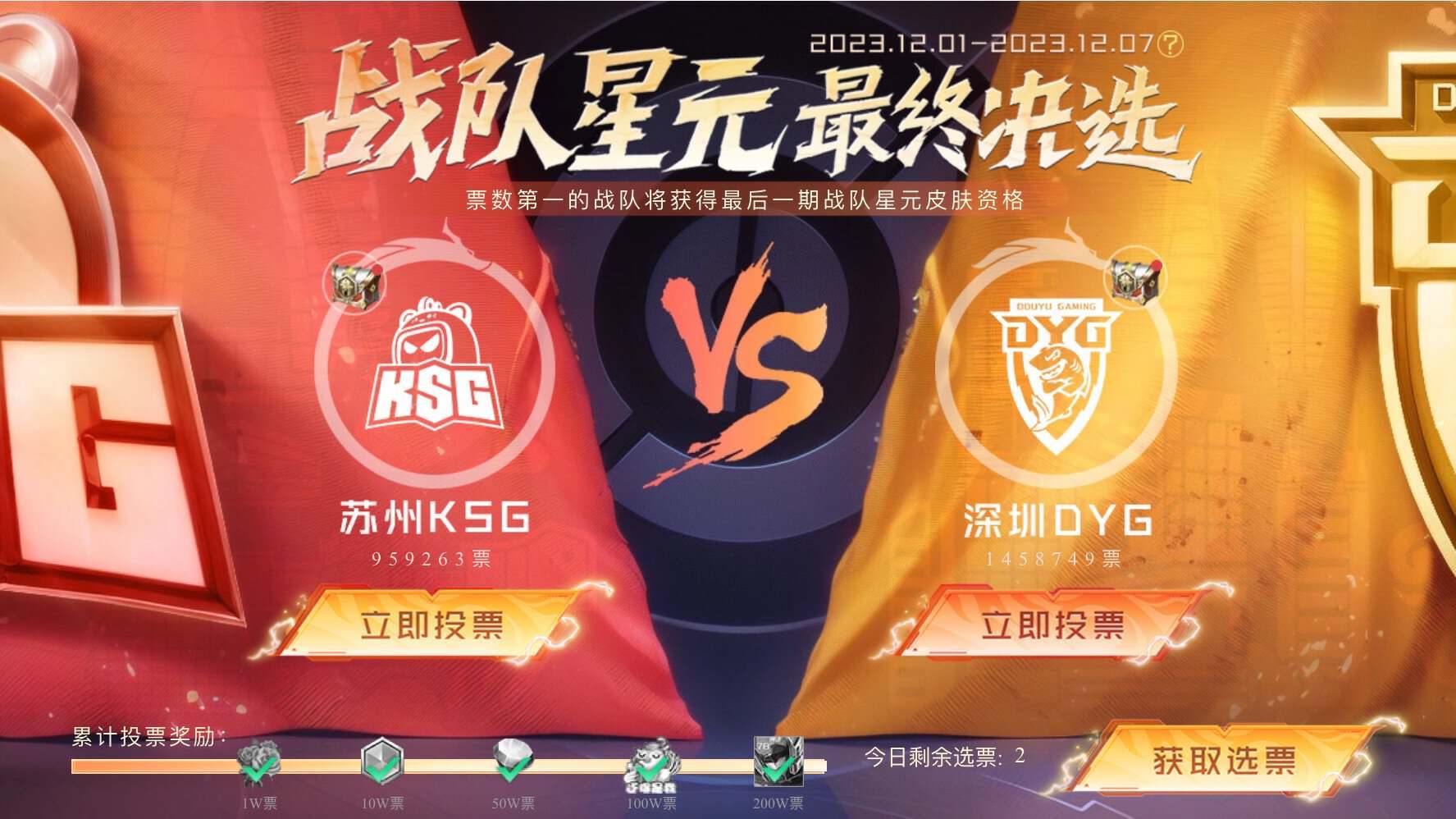 另外,近期开启了战队星元的投票活动,参与投票的有深圳DYG和苏州KSG。虽然目前投票还没结束,但是根据票数来看,深圳DYG还是提前获得了战队星元。