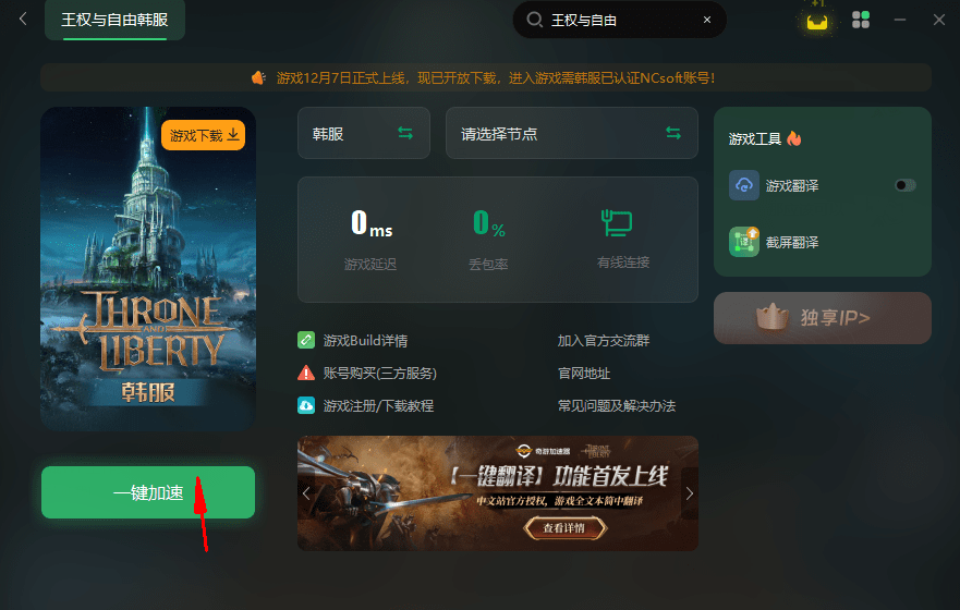 第三步:在奇游界面的右侧,玩家可以点击游戏翻译,这个功能的出现大大简化了游戏语言的转换过程,使得玩家能够轻松将《王权与自由》从韩语版本转换为中文,为更广泛的受众提供了更加友好的游戏体验。